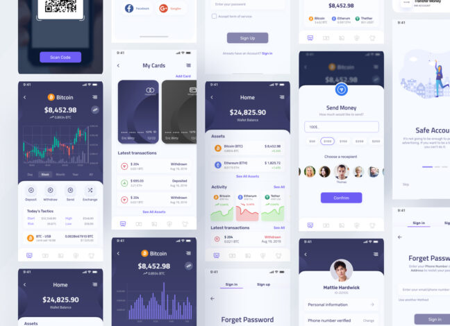 Crypto Wallet Exchange UI Kit Another good UI Kit for crypto wallet and exchange. The kit is compatible with three famous tools: Figma, Sketch and XD. It contains 50+ well-made screens that are clean and well-organized.